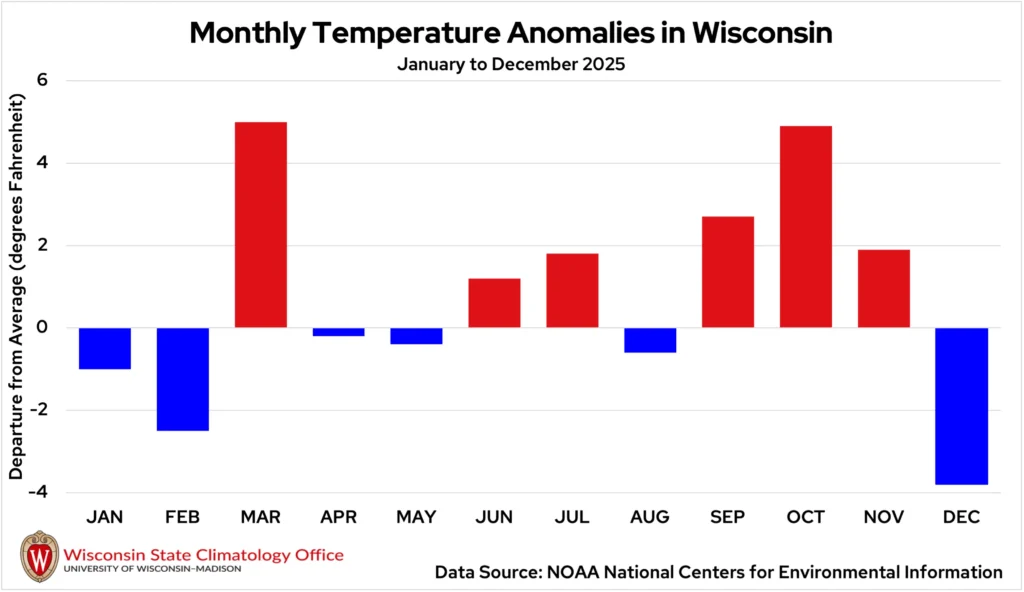 Temperatures in Wisconsin swung sharply throughout the year, with a cold start giving way to repeated stretches of unusual warmth.