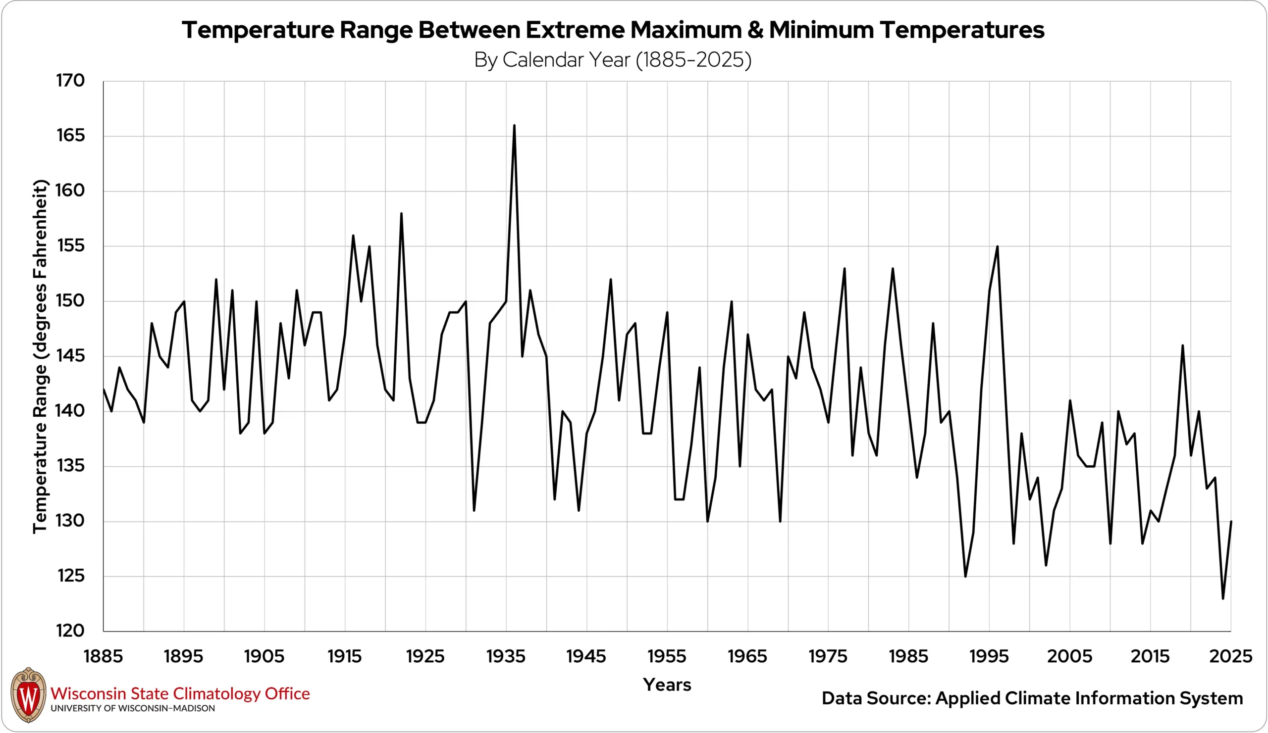 Historically, annual ranges often exceeded the 130-degree mark. However, recent decades have featured a narrowing of this range, reflecting fewer occurrences of extreme cold (minus 30 degrees or colder) and extreme heat (100 degrees or warmer) (Figure 2).