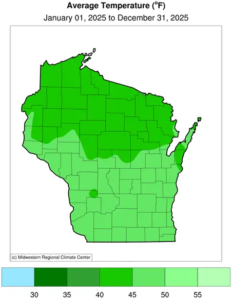 Despite the swings, the warm months outpaced cool ones overall, with a statewide average temperature of 44.6 degrees for the year. This is 0.8 degrees warmer than normal, ranking as Wisconsin’s nineteenth warmest year since records began in 1895 (Figure 3).