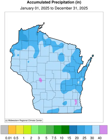 Annual precipitation totals varied widely across the state. Waukesha County recorded 36.28 inches for the year, while Douglas County finished with 23.01 inches. This underscores the strong regional contrasts that accompanied the monthly swings.