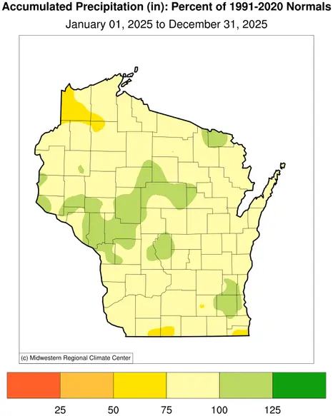 Despite the volatility, Wisconsin averaged 30.61 inches of precipitation in 2025, about 3.44 inches below normal (Figure 5).