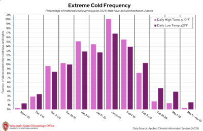 Dane County can get quite chilly once winter rolls around! Some of our coldest days of the year in Wisconsin are when the overnight low temperatures dip below 0°F. The State Climatology Office performed an analysis on the likelihood of a “very cold day” (daily high temperature ≤ 10°F) or “very cold night” (daily low temperature ≤ 0°F) occurring between two calendar dates using historical measured temperature data from NOAA stations in Dane County. Based on this analysis, very cold days and nights have occurred most frequently between January 21 to 31. Over the past 20 years (2005-2024), Dane County experienced, on average, nine very cold days per year and 26 very cold nights per year.
