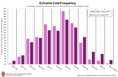 Dane County can get quite chilly once winter rolls around! Some of our coldest days of the year in Wisconsin are when the overnight low temperatures dip below 0°F. The State Climatology Office performed an analysis on the likelihood of a “very cold day” (daily high temperature ≤ 10°F) or “very cold night” (daily low temperature ≤ 0°F) occurring between two calendar dates using historical measured temperature data from NOAA stations in Dane County. Based on this analysis, very cold days and nights have occurred most frequently between January 21 to 31. Over the past 20 years (2005-2024), Dane County experienced, on average, 9 very cold days per year and 26 very cold nights per year.