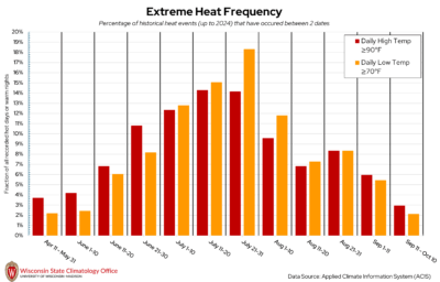 Dane County is no stranger to sweltering summer heat, where daytime temperatures can top 90°F or even 100°F. But when are these hot days most likely to occur in Dane County? The State Climatology Office analyzed the likelihood of a “hot day” (daily high temperature ≥ 90°F) or “warm night” (daily low temperature ≥ 70°F) occurring between two calendar dates using historical measured temperature data from NOAA stations in Dane County. Based on this analysis, hot days have occurred most frequently between July 11 to 31. Late July (21-31) is when warm nights have been the most common. Over the past 20 years (2005-2024), Dane County experiences, on average, 19 hot days per year and 14 warm nights per year.