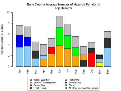 Dane County deals with an array of hazardous weather throughout the year, and the type of hazards vary from season to season. The bar chart and table above are summaries of warnings and advisories issued by the National Weather Service for Dane County over the past 20 years (2005-2024). Looking at hazards by month/season, the winter months are characterized by severe cold and snow events. Severe thunderstorms and flooding are more common in the late spring to early fall when thunderstorms and heavy rain are more common. Frost advisories and freeze warnings are most common in May and October as these are the times of year when we are transitioning into or out of the growing season and plants are susceptible to frost. Overall, the most common hazards in a year in Dane County are severe thunderstorms, winter weather, and dense fog. Tornadoes are more uncommon, with four tornado warnings issued each year for the county, on average.