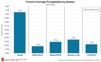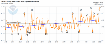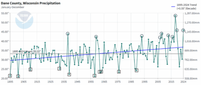 Annual precipitation shows a lot of year-to-year variability. However, there are two notable trends that come from this dataset. First, precipitation is increasing at a rate of 0.55 inches per decade from 1895 to 2024. That’s an increase of one inch approximately every 18 years. Second, if we look at the top ten wettest years since 1895 (black circles), seven have occurred within the past 20 years. By contrast, of the top ten driest years (black squares), all occurred prior to 2000. These trends are quite similar to what has been observed in Dane County with temperatures since 1895.