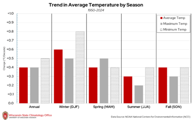 Temperatures have been increasing since 1950 in Dane County on the annual and seasonal time scales, which is the case for most of Wisconsin. Since 1950, annual average temperatures in Dane County have increased at a rate of 0.4°F/decade, which translates to an increase of 1°F every 25 years. This increase in temperature has been most pronounced in the winter months and less pronounced in the summer months. When average temperatures are split into daily high and low temperatures, low temperatures have been warming at a faster rate compared to high temperatures.