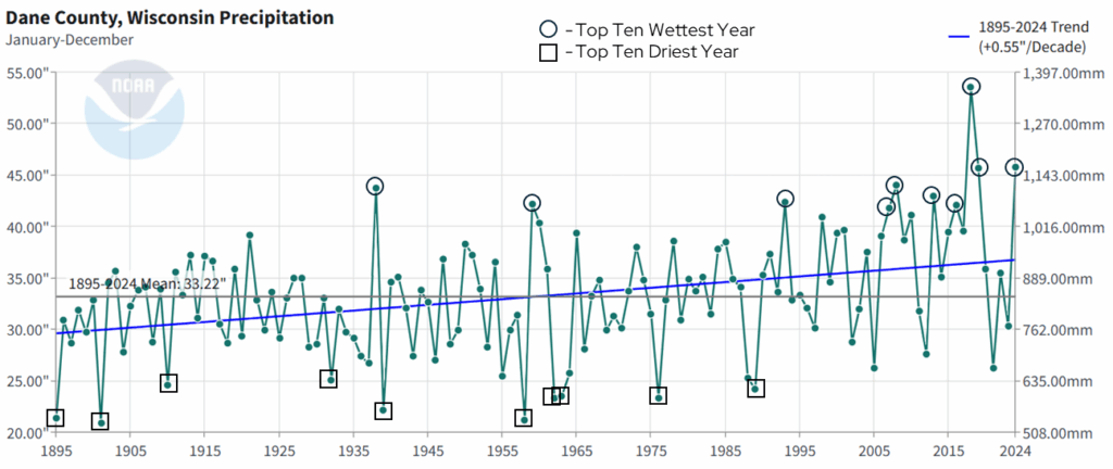 Annual precipitation shows a lot of year-to-year variability, which is normal within a long-term trend. However, there are two notable trends that come from this dataset. First, precipitation is increasing at a rate of 0.55 inches per decade from 1895 to 2024. That’s an increase of one inch approximately every 18 years. Second, if we look at the top ten wettest years since 1895 (black circles), seven have occurred within the past 20 years. By contrast, of the top ten driest years (black squares), all occurred prior to 2000. These trends are quite similar to what has been observed in Dane County with temperatures since 1895.