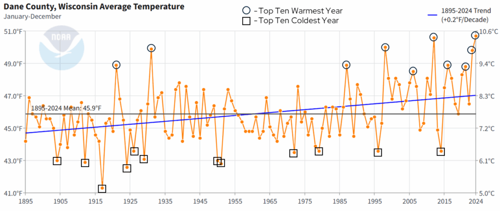 With temperatures warming, this does not mean that every year will be warmer than the last, or that more recent years will all have above-average (1895-2024) temperatures. However, Dane County is experiencing more years that are above average than it did in the past. For example, since 2000, Dane County has experienced only four years with below-average temperatures. Similarly, if we rank the top ten warmest years in Dane County since 1895 (black circles on the above chart), six have occurred since 2000. The top ten coldest years (black squares) are a bit more spread out over time, with just one of the top ten years occurring since 2000.