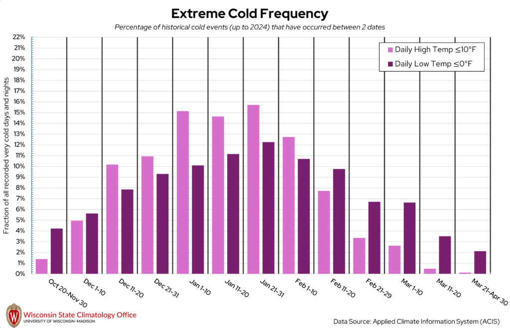 Douglas County can get quite chilly once winter rolls around! Some of our coldest days of the year in Wisconsin are when the overnight low temperatures dip below 0°F. The State Climatology Office performed an analysis on the likelihood of a “very cold day” (daily high temperature ≤ 10°F) or “very cold night” (daily low temperature ≤ 0°F) occurring between two calendar dates using historical measured temperature data from NOAA stations in Douglas County. Based on this analysis, very cold days and nights have occurred most frequently between January 21 to 31. Over the past 20 years (2005-2024), Douglas County experienced, on average, 19 very cold days per year and 52 very cold nights per year.