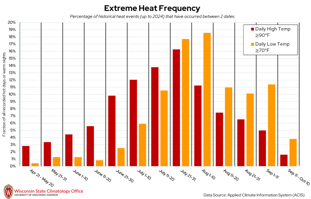 Douglas County is no stranger to sweltering summer heat, where daytime temperatures can top 90°F or even 100°F. But when are these hot days most likely to occur in Douglas County? The State Climatology Office analyzed the likelihood of a “hot day” (daily high temperature ≥ 90°F) or “warm night” (daily low temperature ≥ 70°F) occurring between two calendar dates using historical measured temperature data from NOAA stations in Douglas County. Based on this analysis, hot days have occurred most frequently between July 21 to 31. Warm nights have been most common from August 1 to 10. Over the past 20 years (2005-2024), Douglas County experienced, on average, 12 hot days per year and three warm nights per year.