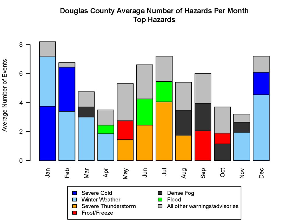 Douglas County deals with an array of hazardous weather throughout the year, and the type of hazards vary from season to season. The bar chart and table above are summaries of warnings and advisories issued by the National Weather Service for Douglas County over the past 20 years (2005-2024). Looking at hazards by month/season, the months of November through March are characterized by severe cold, snow events, and dense fog. Severe thunderstorms and flooding are more common in the late spring through summer. Frost advisories and freeze warnings are most common in May, September, and October as these are the times of year when we are transitioning into or out of the growing season, and plants are susceptible to frost. Dense fog advisories are most common from August through October. Overall, the most common hazards in a year in Douglas County are winter weather, dense fog, and severe thunderstorms. Tornadoes are less common, with one tornado warning issued every two years for the county, on average.