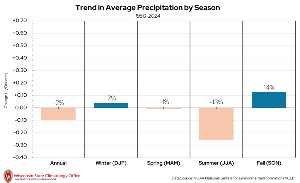 Annual precipitation is expected to increase by around five percent by mid-century, according to WICCI projections. Winter and spring are projected to be the seasons of greatest precipitation increase in Douglas County (about 10%), with summers projected to be 5% drier by mid-century. Despite projections for drier summers, the frequency of heavy precipitation days (two inches or more) is projected to increase by mid-century.