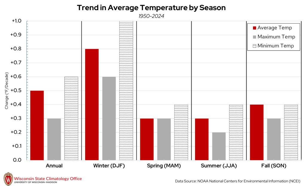 Temperatures have been increasing since 1950 in Douglas County on the annual and seasonal time scales, which is the case for most of Wisconsin. Since 1950, annual average temperatures in Douglas County have increased at a rate of 0.5°F/decade, which translates to an increase of 1°F every 20 years. This increase in temperature has been most pronounced in the winter months and less pronounced in the other seasons. When annual average temperatures are split into daily high and low temperatures, low temperatures have been warming at a faster rate compared to high temperatures across most seasons.