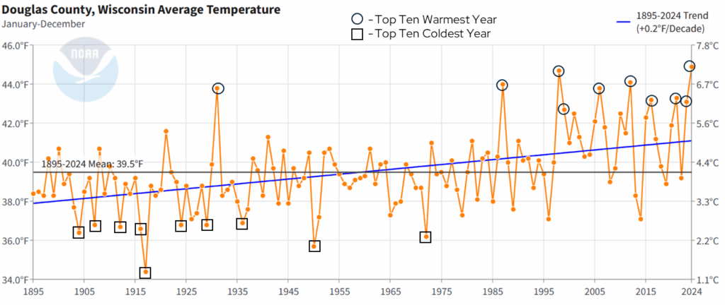 The data in this publication are a snapshot of the historical climate data for Douglas County. If you have questions about this publication or would like more data on a topic, please contact the Wisconsin State Climatology Office.