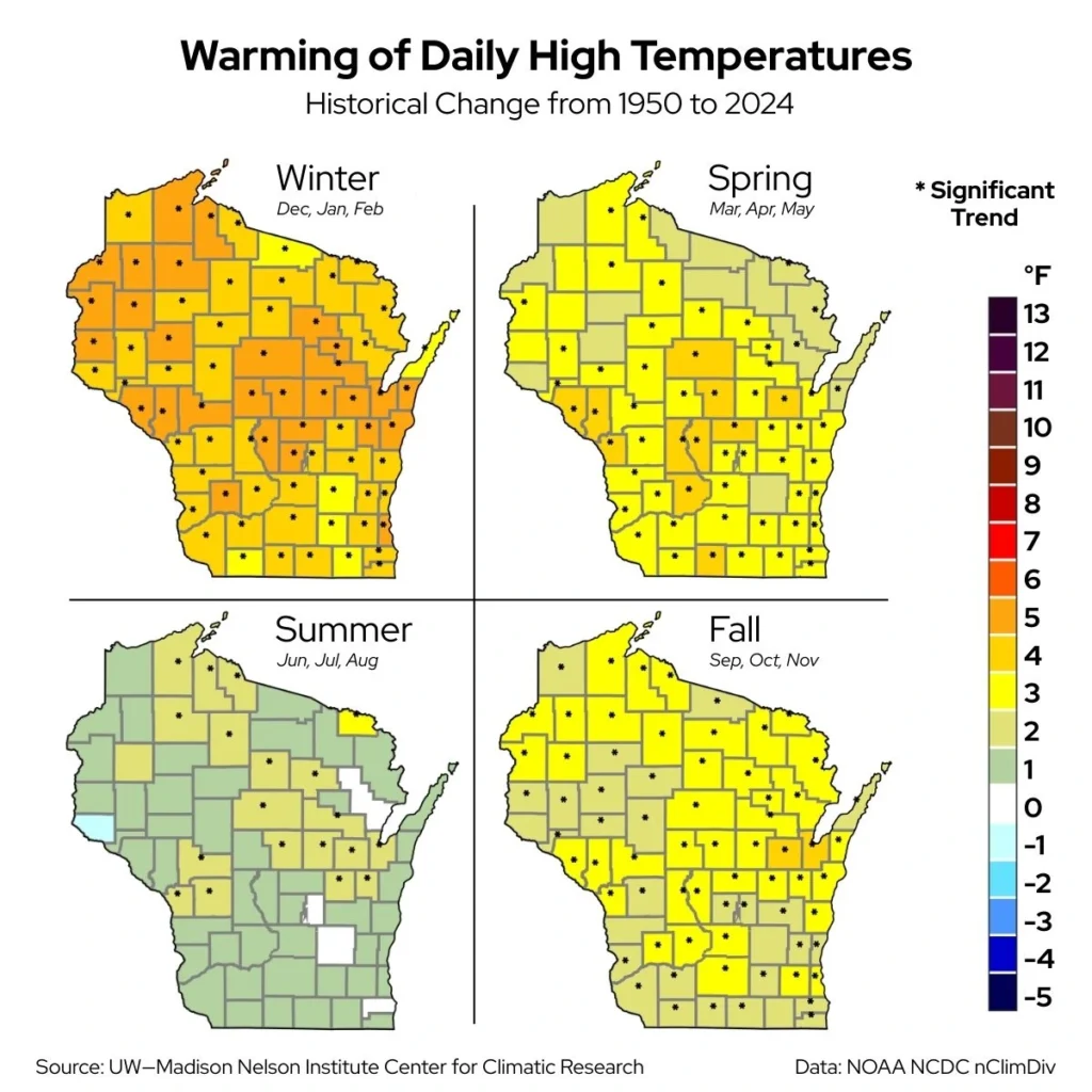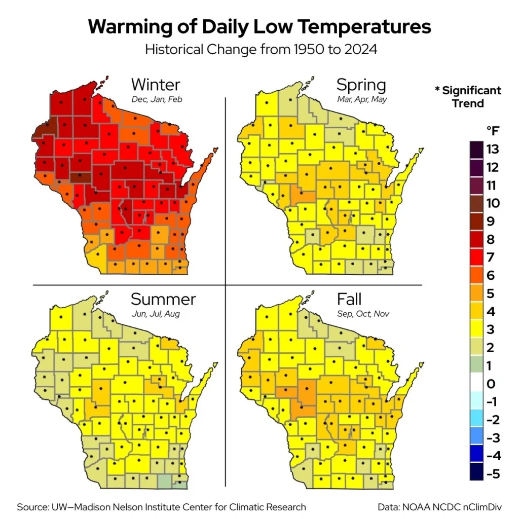 Wisconsin is experiencing warmer temperatures across all seasons, at all times of day, but the warming is occurring at different rates.
