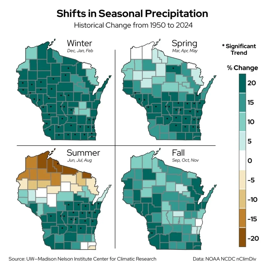 Different regions of the Badger State have seen varying shifts in precipitation from season to season.