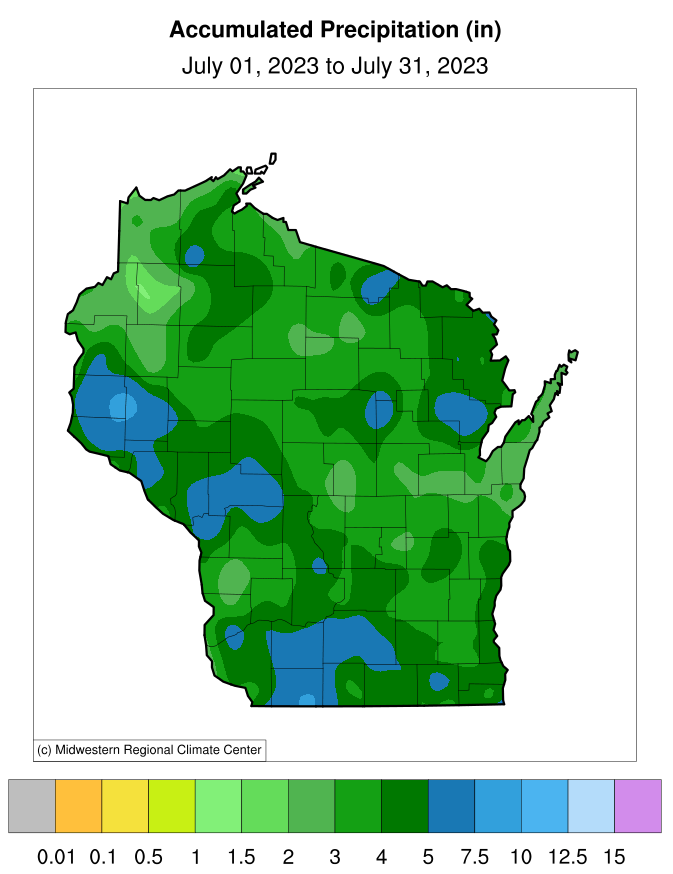 The increased rainfall Wisconsin received in July 2023 unfortunately did little to alleviate the state’s drought conditions — in fact, our drought actually got worse. Fortunately, we did not experience the exceptionally high temperatures that have accompanied previous droughts.
