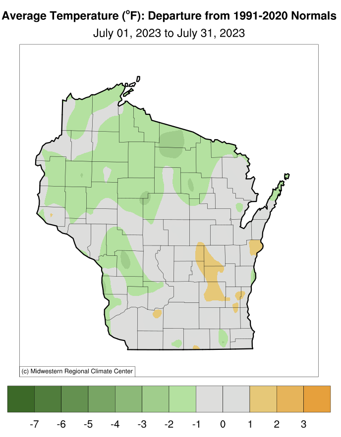 The moderate temperatures last month continued the trend since the drought began. Wisconsin’s three-month average temperature from May through July was only 0.8°F higher than the 1991-2020 normal. The weather during this period was thus not only mostly comfortable, but the absence of extreme heat significantly tempered the worst impacts of the drought.