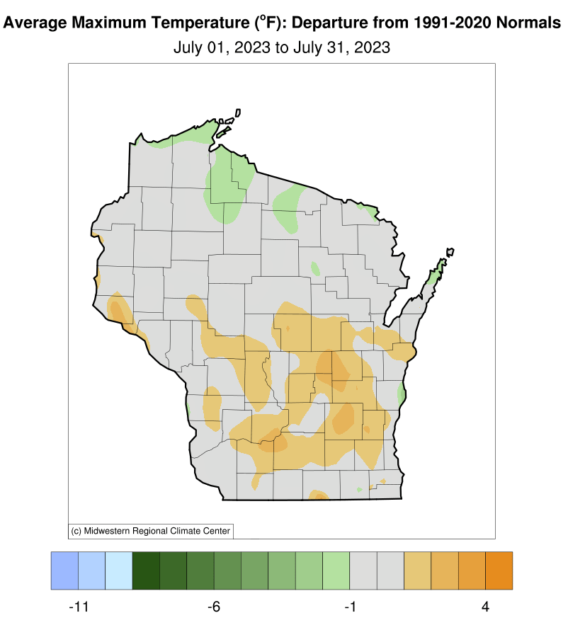 Although major droughts often coincide with exceptional heat (e.g., the summers of 2012 and 1988), temperatures during July were quite moderate. In fact, Wisconsin’s July average temperature of 68.5°F was slightly cooler (by 0.7 degrees) than the 1991-2020 mean, and most of the state landed within 1 degree of normal. There were also relatively few hot days, as exemplified by the modest frequency of temperatures exceeding 90 degrees. None of the “first-order” weather stations around the state (Eau Claire, Wausau, Green Bay, Milwaukee, Madison and La Crosse) registered more than a handful of these hot days during July.