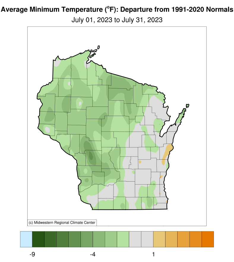 The prevalence of dry air during the drought was especially effective at promoting nighttime cooling, because low humidity enables Earth’s surface to shed heat to space efficiently. Most of Wisconsin experienced overnight low temperatures during July of more than 1 degree below normal, and negative anomalies were greater than 3 degrees in many places.
