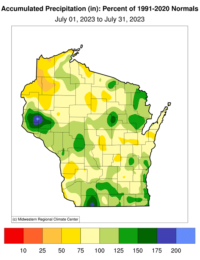 Drought conditions expanded in Wisconsin during July, despite greater rainfall than during the preceding two months. The statewide-average precipitation of 3.75 inches during July was actually unremarkable: 0.29 inches below the 1991-2020 normal and the 69th driest in the 129 years of record-keeping. Most parts of the state received near-normal rainfall in excess of 3 inches, except for the northwest. Within this region the counties of Douglas, Washburn, Barron and Burnett were especially dry, with less than 75% of normal precipitation. Even though rainfall rebounded during July in most of the state, it wasn’t nearly enough to make up for the acute deficits Wisconsin endured in the late spring and early summer. In fact, the state endured its fifth driest May-July period on record.