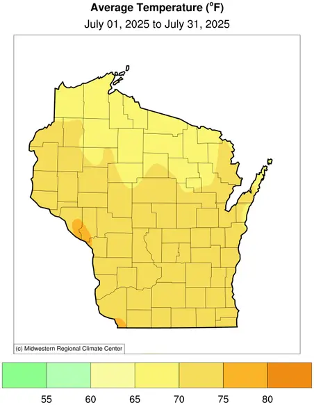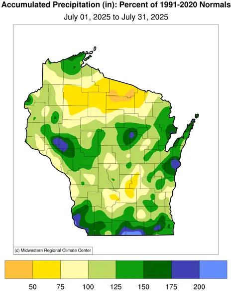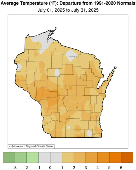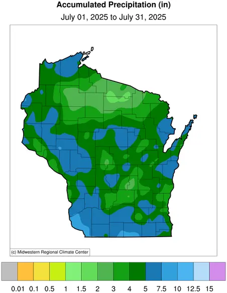 July’s warmth and mugginess brought a mix of favorable and challenging conditions for Wisconsin agriculture. Farmers also navigated smoky skies from Canadian wildfires. While the smoke likely was not dense enough to cause major crop issues, even light smoke can influence crop growth in competing ways, such as reducing direct sunlight, which can slow photosynthesis, and also increasing diffuse solar radiation that penetrates deeper into plant canopies.