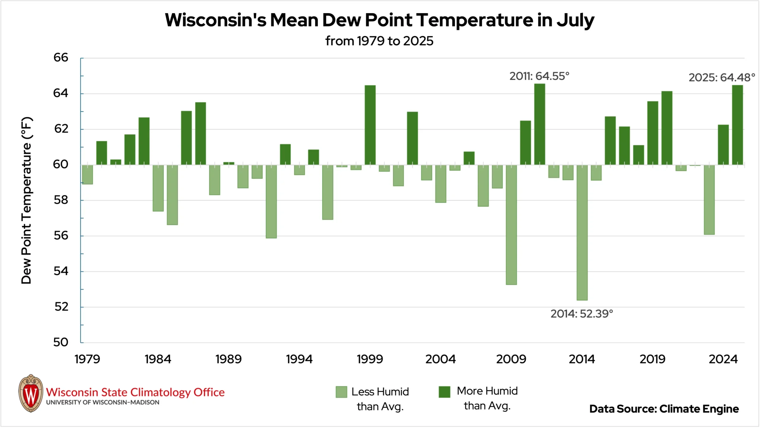 To make matters worse, dew point temperatures rose to the lower 70s and even mid-70s in some locations, making for incredibly muggy and uncomfortable conditions to end the month. In fact, July 2025’s average dew point temperature (64.48 degrees) was the second-highest July monthly average on record in Wisconsin going back to 1979 (Figure 3).