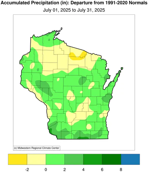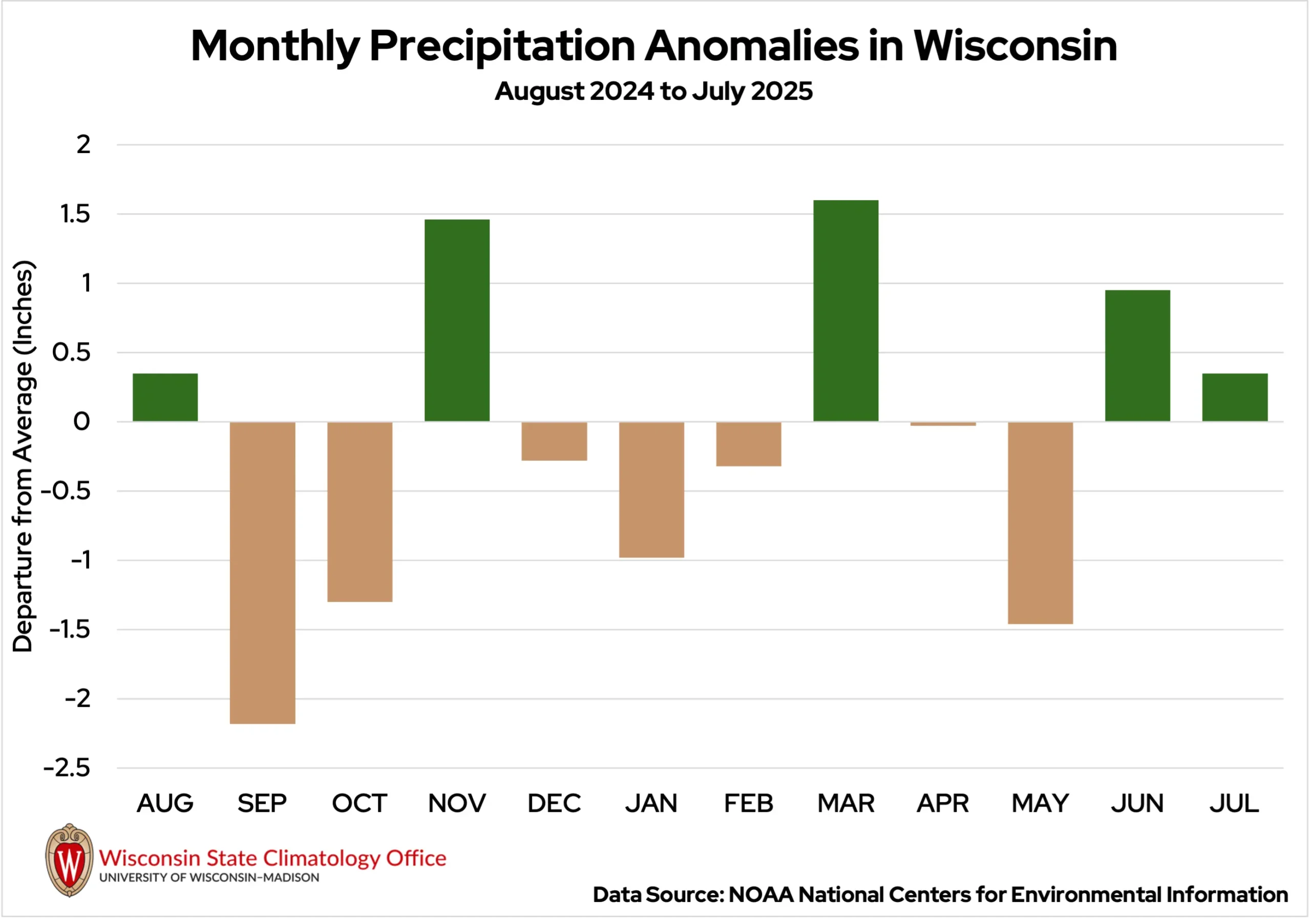 For what’s typically Wisconsin’s second wettest month of the year, July didn’t disappoint! Overall, the state averaged 4.39 inches of rainfall in July, 0.35 inches above the 30-year average (Figure 4).