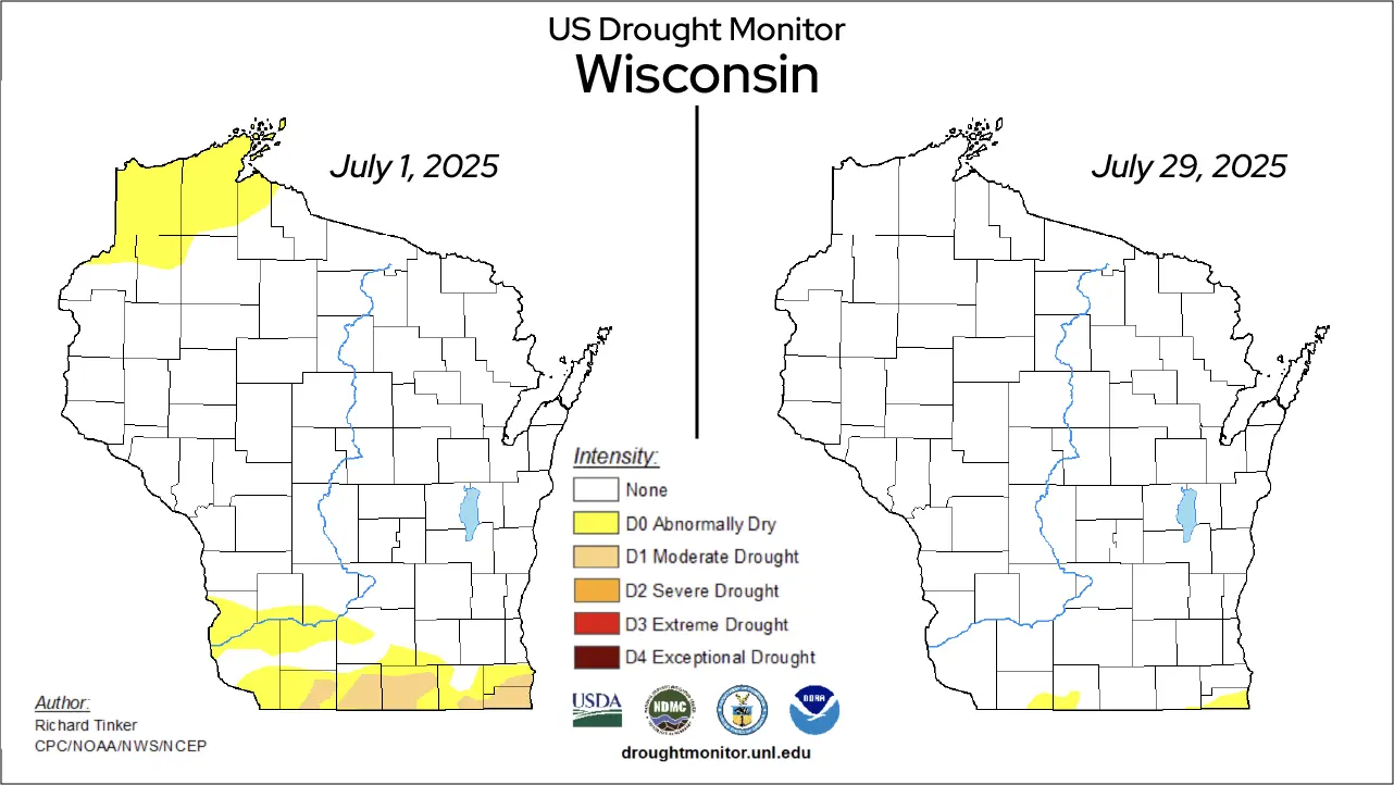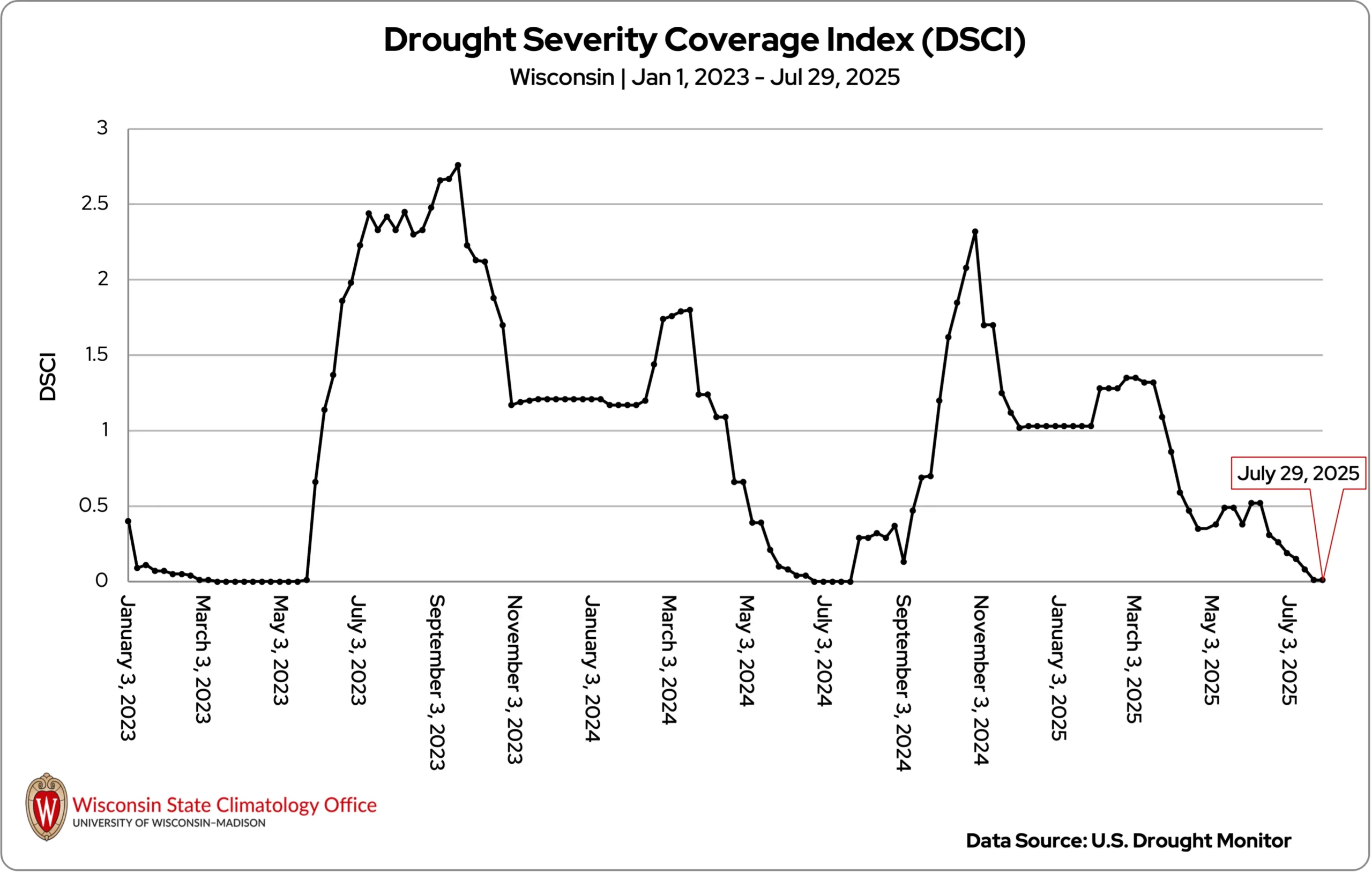 Rounds of thunderstorms through the early and middle part of the month satiated the dry conditions in the northwest and eliminated drought conditions in the southern counties. On July 22, Wisconsin was officially drought-free! This brought the state’s Drought Severity Coverage Index to 0.01, the lowest it has been since July 24, 2024 (Figure 7). Stubborn areas of abnormal dryness (D0) remained in parts of Lafayette, Green, and Racine counties at the end of the month.