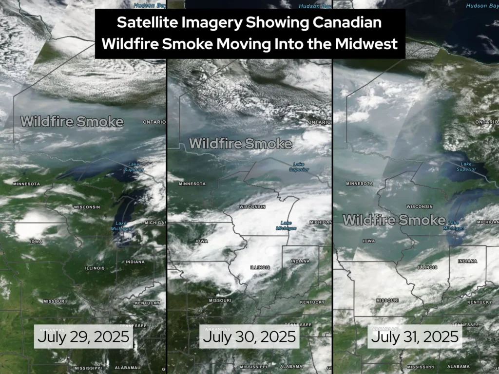 Plumes of wildfire smoke from Canada settled over the Midwest many times during July, diminishing air quality and creating hazy skies. Smoke from fires in Saskatchewan, Manitoba, and Ontario was carried into Wisconsin by the flow of northwesterly winds (Image 5).