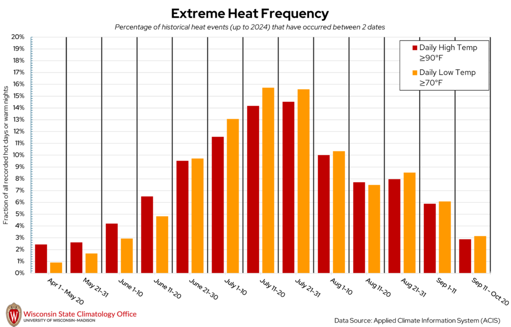 La Crosse County is no stranger to sweltering summer heat, where daytime temperatures can top 90°F or even 100°F. But when are these hot days most likely to occur in La Crosse County? The State Climatology Office analyzed the likelihood of a “hot day” (daily high temperature ≥ 90°F) or “warm night” (daily low temperature ≥ 70°F) occurring between two calendar dates using historical measured temperature data from NOAA stations in La Crosse County. Based on this analysis, hot days and warm nights have occurred most frequently between July 11 to 31. Over the past 20 years (2005-2024), La Crosse County experienced, on average, 19 hot days per year and 14 warm nights per year.