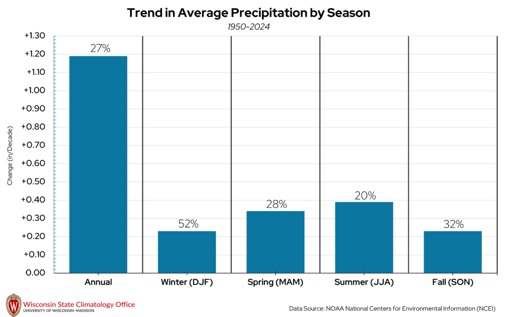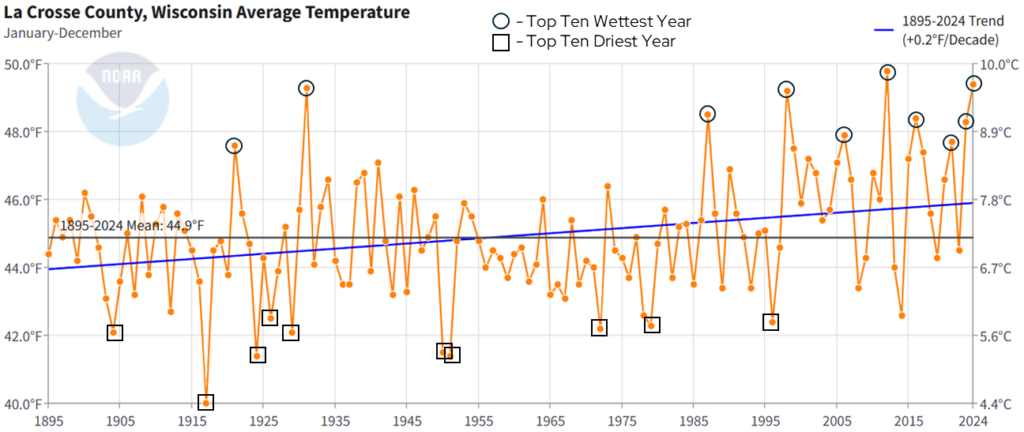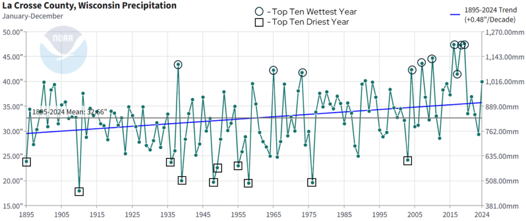 Annual precipitation shows a lot of year-to-year variability, which is normal within a long-term trend. However, there are two notable trends that come from this dataset. First, precipitation is increasing at a rate of 0.48 inches per decade from 1895 to 2024. That’s an increase of one inch approximately every 21 years. Second, if we look at the top ten wettest years since 1895 (black circles), seven have occurred since 2000. By contrast, of the top ten driest years (black squares), nine occurred prior to 2000. These trends are quite similar to what has been observed in La Crosse County with temperatures since 1895.