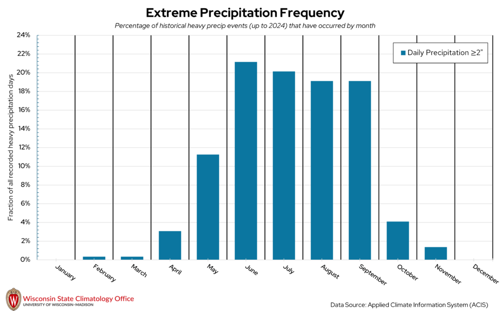 Heavy precipitation days, which for this publication refers to a one-day liquid precipitation total of two inches or more, can impact La Crosse County at all times of the year. Extreme precipitation in the winter is measured by the amount of liquid that would be present if you melted down all of the snow that fell that day. The vast majority of these heavy precipitation days (80 percent) have occurred from June through September. August is the month that has historically had the most heavy precipitation days in La Crosse County. In general, summer is the wettest season in La Crosse County, with winter being the driest season. Over the past 20 years (2005-2024), La Crosse County experienced, on average, 15 heavy precipitation days per decade.