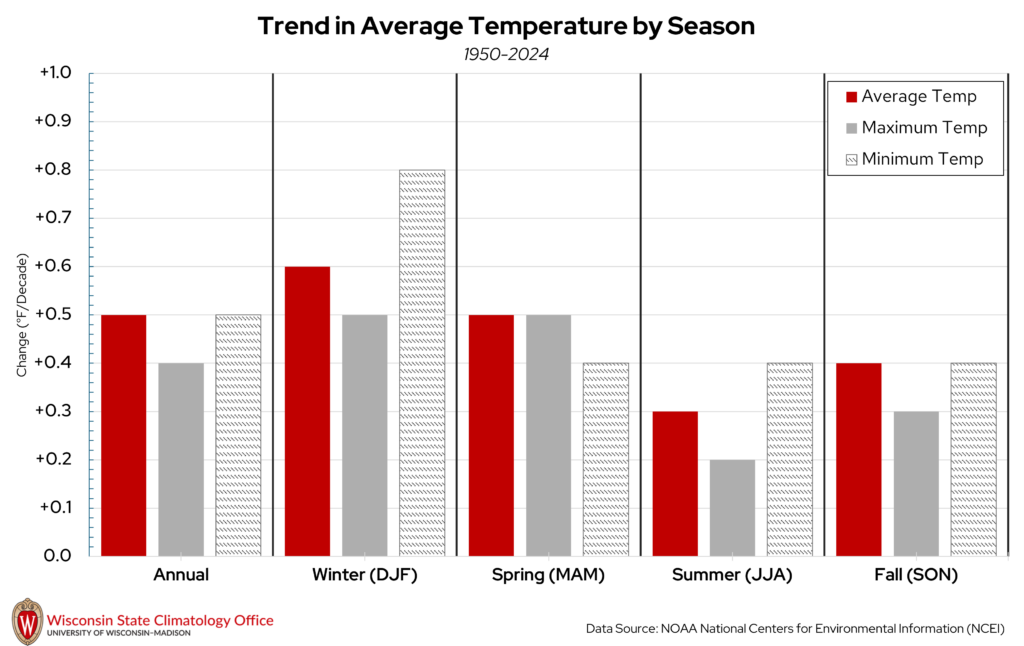 Temperatures have been increasing since 1950 in La Crosse County on the annual and seasonal time scales, which is the case for most of Wisconsin. Since 1950, annual average temperatures in La Crosse County have increased at a rate of 0.5°F/decade, which translates to an increase of 1°F every 20 years. This increase in temperature has been most pronounced in the winter months and less pronounced in the summer months. When average temperatures are split into daily high and low temperatures, low temperatures have been warming at a faster rate compared to high temperatures.