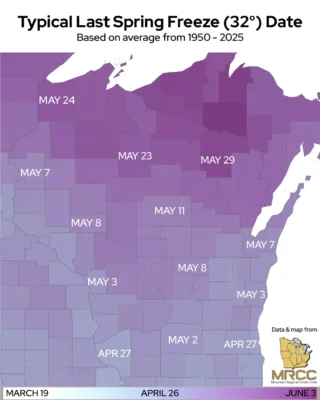 Freezing conditions typically come to an end in far southern Wisconsin in late April, but persist in northern Wisconsin through mid to late May. The Midwestern Regional Climate Center has created an interactive Freeze Date Tool using data from 1950 onward at numerous stations across the Upper Midwest. This tool provides a long-term perspective of the frost and freeze conditions found at the county level and how those conditions have changed over the last 70 years.