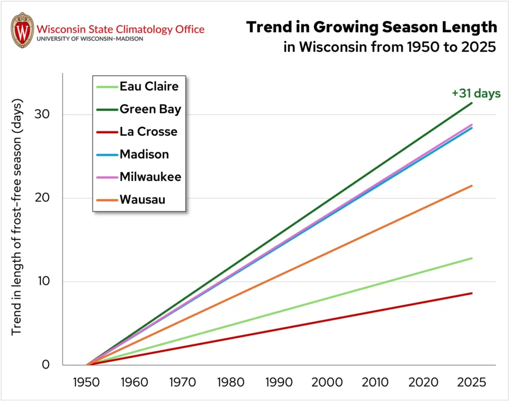 Since 1950, Wisconsin’s growing season has expanded. The frost-free season has changed most significantly in eastern and southern Wisconsin, lengthening by more than 25 days. Smaller changes have been seen in western Wisconsin, where Eau Claire and La Crosse’s growing seasons have lengthened by less than two weeks.