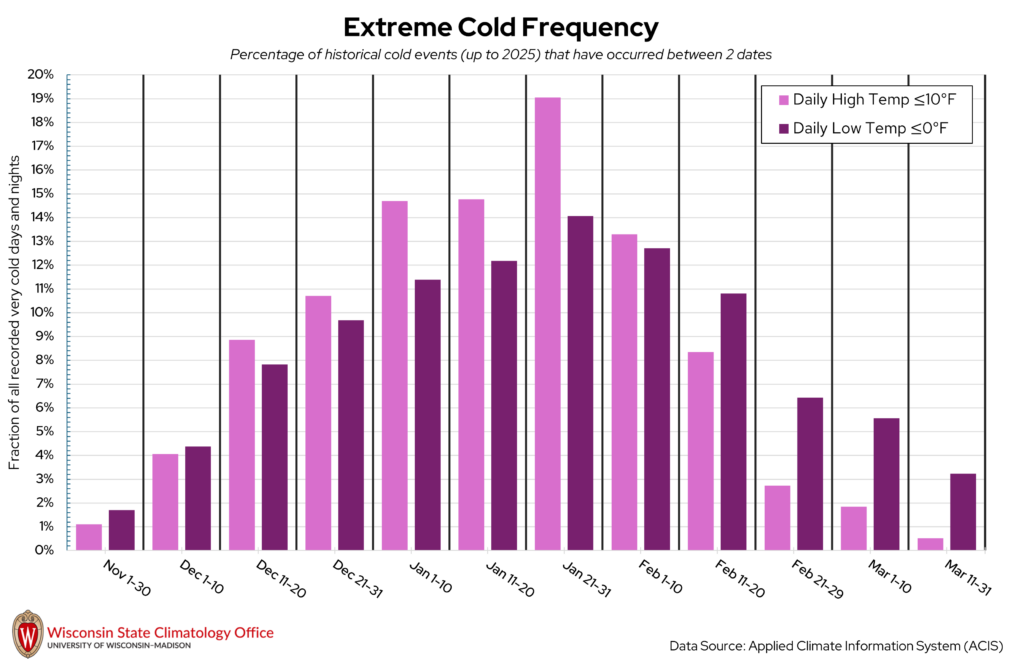 Marathon County can get quite chilly once winter rolls around! Some of our coldest days of the year in Wisconsin are when the overnight low temperatures dip below 0°F. The State Climatology Office performed an analysis on the likelihood of a “very cold day” (daily high temperature ≤ 10°F) or “very cold night” (daily low temperature ≤ 0°F) occurring between two calendar dates using historical measured temperature data from NOAA stations in Marathon County. Based on this analysis, very cold days and nights have occurred most frequently between January 21 to 31. Over the past 20 years (2006-2025), Marathon County experienced, on average, nine very cold days per year and 23 very cold nights per year.
