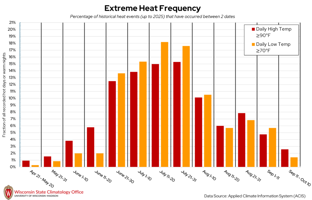 Marathon County is no stranger to sweltering summer heat, where daytime temperatures can top 90°F or even 100°F. But when are these hot days most likely to occur in Marathon County? The State Climatology Office analyzed the likelihood of a “hot day” (daily high temperature ≥ 90°F) or “warm night” (daily low temperature ≥ 70°F) occurring between two calendar dates using historical measured temperature data from NOAA stations in Marathon County. Based on this analysis, hot days and warm nights have occurred most frequently between July 11 to 31. Over the past 20 years (2006-2025), Marathon County experienced, on average, five hot days per year and three warm nights per year.