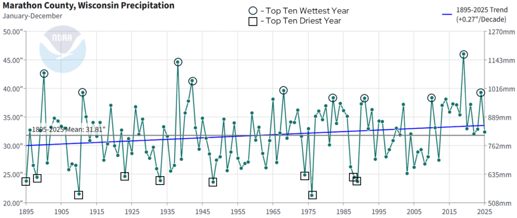 Annual precipitation shows a lot of year-to-year variability, which is normal within a long-term trend. However, there are two notable trends that come from this dataset. First, precipitation is increasing at a rate of 0.27 inches per decade from 1895 to 2025. That’s an increase of one inch approximately every 37 years. Second, if we look at the top ten wettest years since 1895 (black circles), three have occurred since 2000, but overall the top ten wettest years are very spread out over this time period. However, all of the top ten driest years (black squares) occurred prior to 1990 and 2012 was the most recent year with below average precipitation.