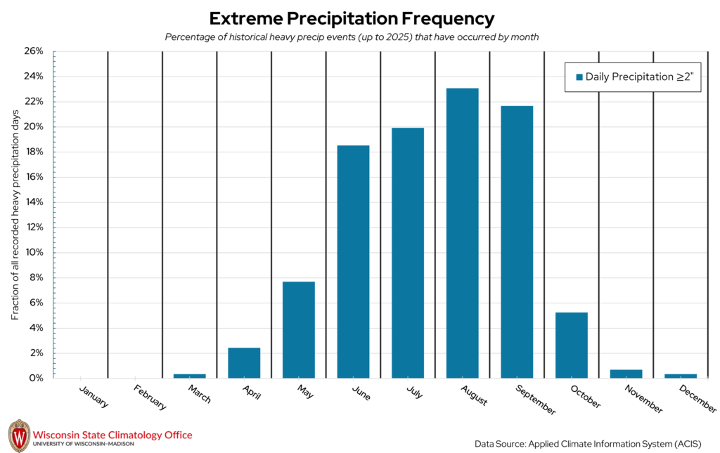 Heavy precipitation days, which for this publication refers to a one-day liquid precipitation total of two inches or more, can impact Marathon County at all times of the year. Extreme precipitation in the winter is measured by the amount of liquid that would be present if you melted down all of the snow that fell that day. The vast majority of these heavy precipitation days (83 percent) have occurred from June through September. August is the month that has historically had the most heavy precipitation days in Marathon County. In general, summer is the wettest season in Marathon County, with winter being the driest season. Over the past 20 years (2006-2025), Marathon County experienced, on average, 10 heavy precipitation days per decade.