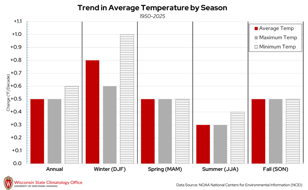 Temperatures have been increasing since 1950 in Marathon County on the annual and seasonal time scales, which is the case for most of Wisconsin. Since 1950, annual average temperatures in Marathon County have increased at a rate of 0.5°F/decade, which translates to an increase of 1°F every 20 years. This increase in temperature has been most pronounced in the winter months and less pronounced in the summer months. When average temperatures are split into daily high and low temperatures, low temperatures have been warming at a faster rate compared to high temperatures.