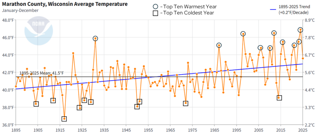 With temperatures warming, this does not mean that every year will be warmer than the last, or that more recent years will all have above-average (1895-2025) temperatures. However, Marathon County is experiencing more years that are above average than it did in the past. For example, since 2000, Marathon County has experienced only five years with below-average temperatures. Similarly, if we rank the top ten warmest years in Marathon County since 1895 (black circles on the above chart), seven have occurred since 2000, with 1998 also in the top ten. The top ten coldest years (black squares) are a bit more spread out over time, with nine of the top ten years occurring before 2000.