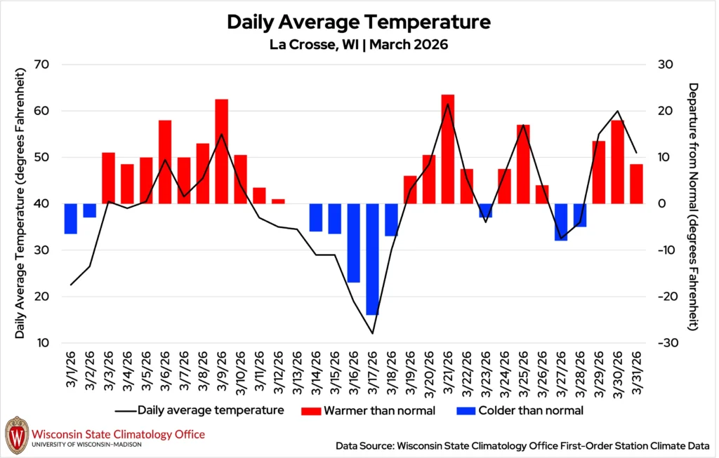La Crosse soared to 83 degrees on March 21 — an astonishing 35 degrees warmer than the normal high temperature — shattering its previous daily record of 75 degrees, set in 1911 and 2022. This tied with Sparta (Monroe County) and Prairie du Chien (Crawford County) for the warmest temperature observed anywhere in the state this month.