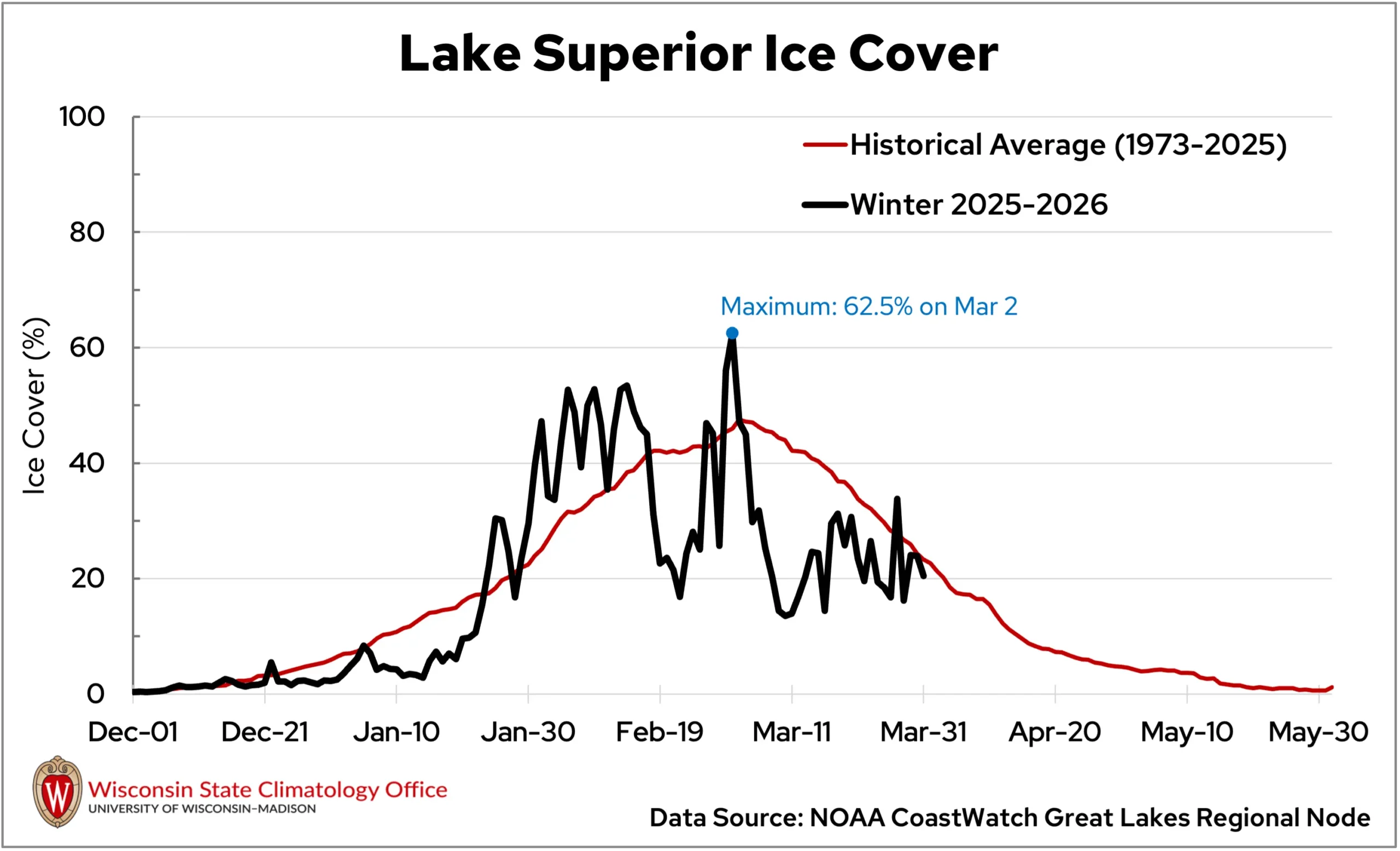 March brought a rapid transition from winter ice to open water. A brief cooldown around the start of the month allowed ice to hang on a little longer, even helping Lake Superior reach its seasonal ice peak of 63 percent on March 2. But persistent warmth quickly took over, reducing Lake Superior ice cover to 14 percent by March 10, the lowest extent since January 22 (Figure 10).