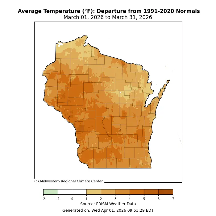 A final burst of summerlike warmth arrived on March 30, when 70s stretched from southeastern to west-central Wisconsin. Madison tied its daily record high of 78 degrees, first set in 1967 — a temperature more typical of mid-June than late March.