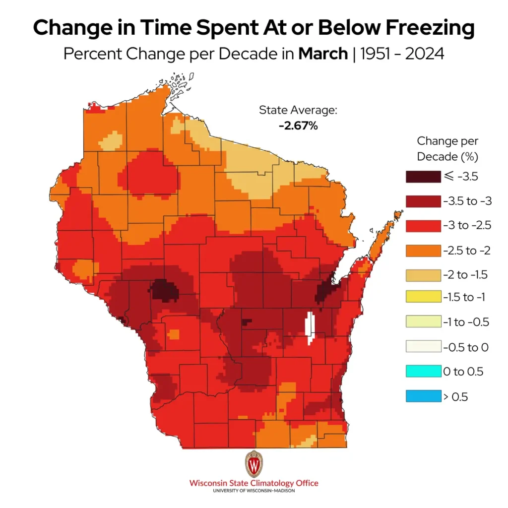 Even with the mid-month winter conditions, the longer-term trend continues to point toward less time spent below freezing during March. Since 1951, the number of March hours below freezing has declined substantially statewide. Most of the state has lost roughly two to three percent of sub-freezing hours per decade (Figure 4). That translates to losing about one sub-freezing hour every March.