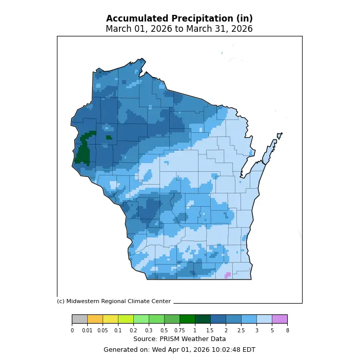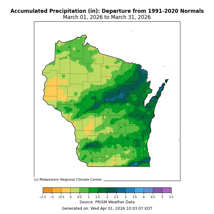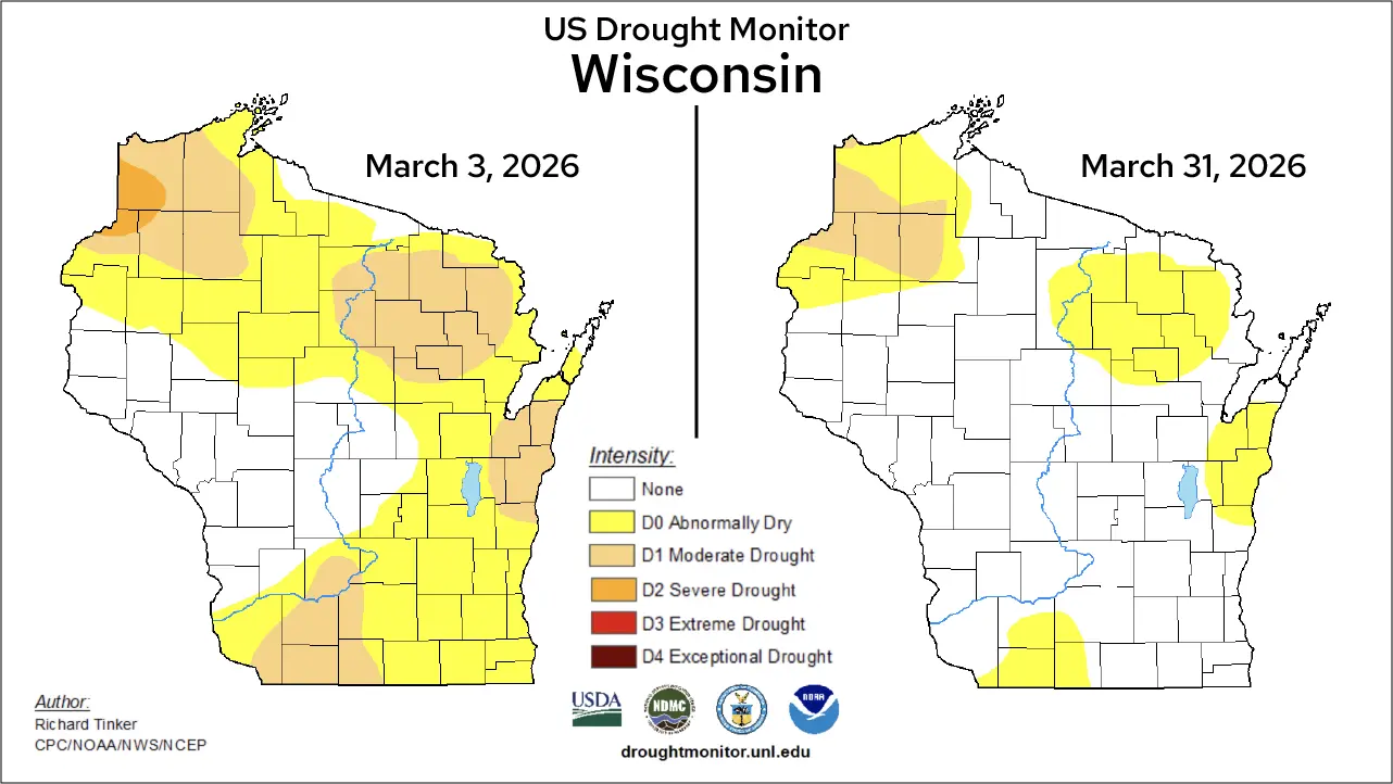 Severe drought (D2) had receded from the state by mid-month, along with nearly all areas of moderate drought (D1). By March 31, only a sliver of northwestern Wisconsin remained in moderate drought (Figure 9). Wisconsin ended the month with 73 percent of the state reporting normal soil conditions.
