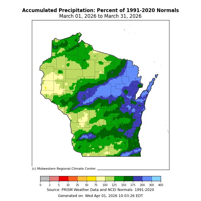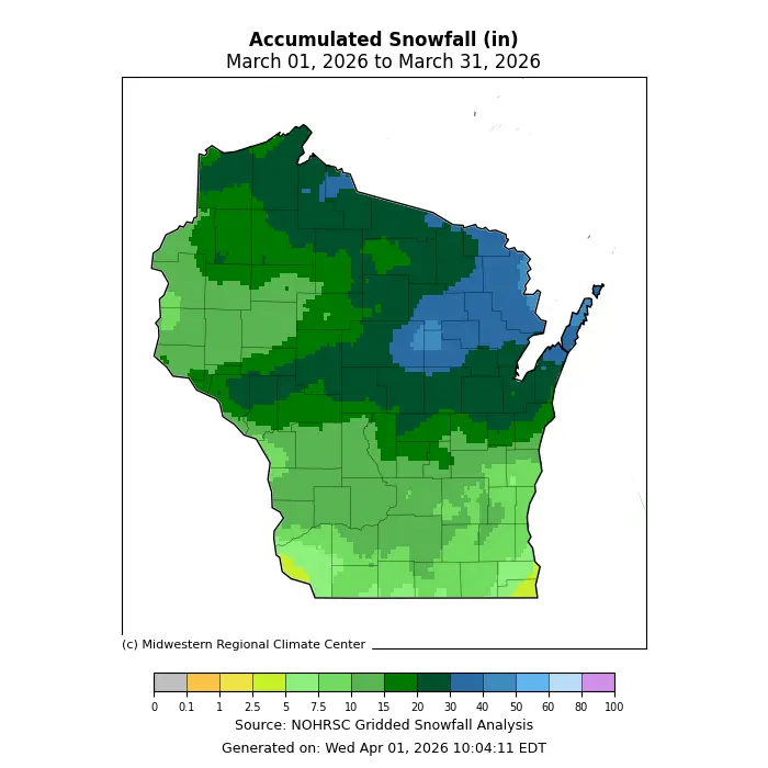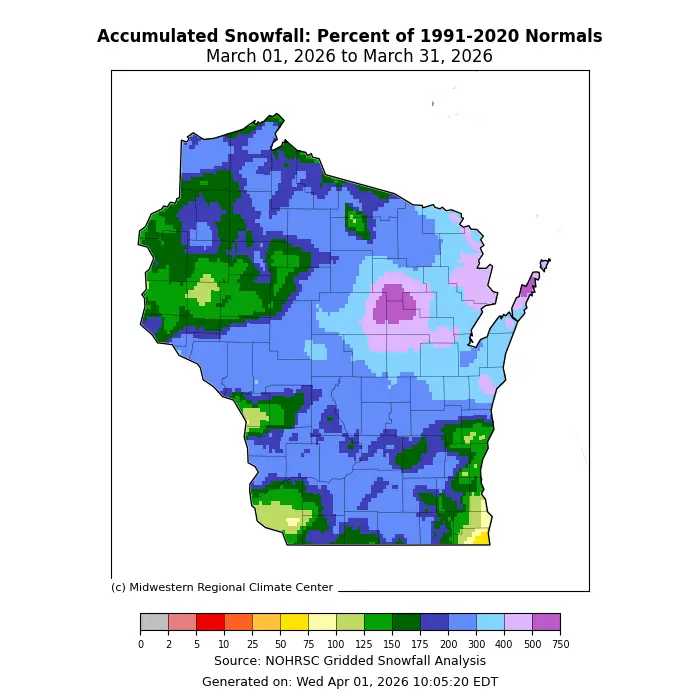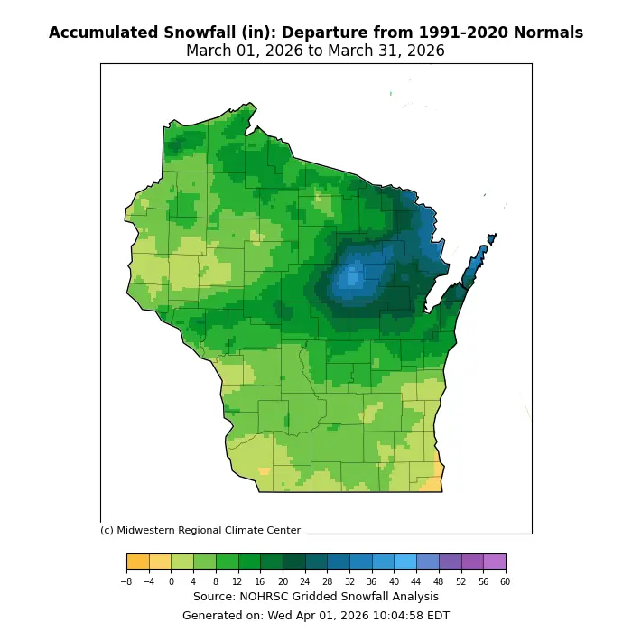 Statewide, March was snowier than normal by 10.1 inches, with a statewide average of 18.2 inches (Figure 7). This makes 2026 Wisconsin’s seventh snowiest March on record.