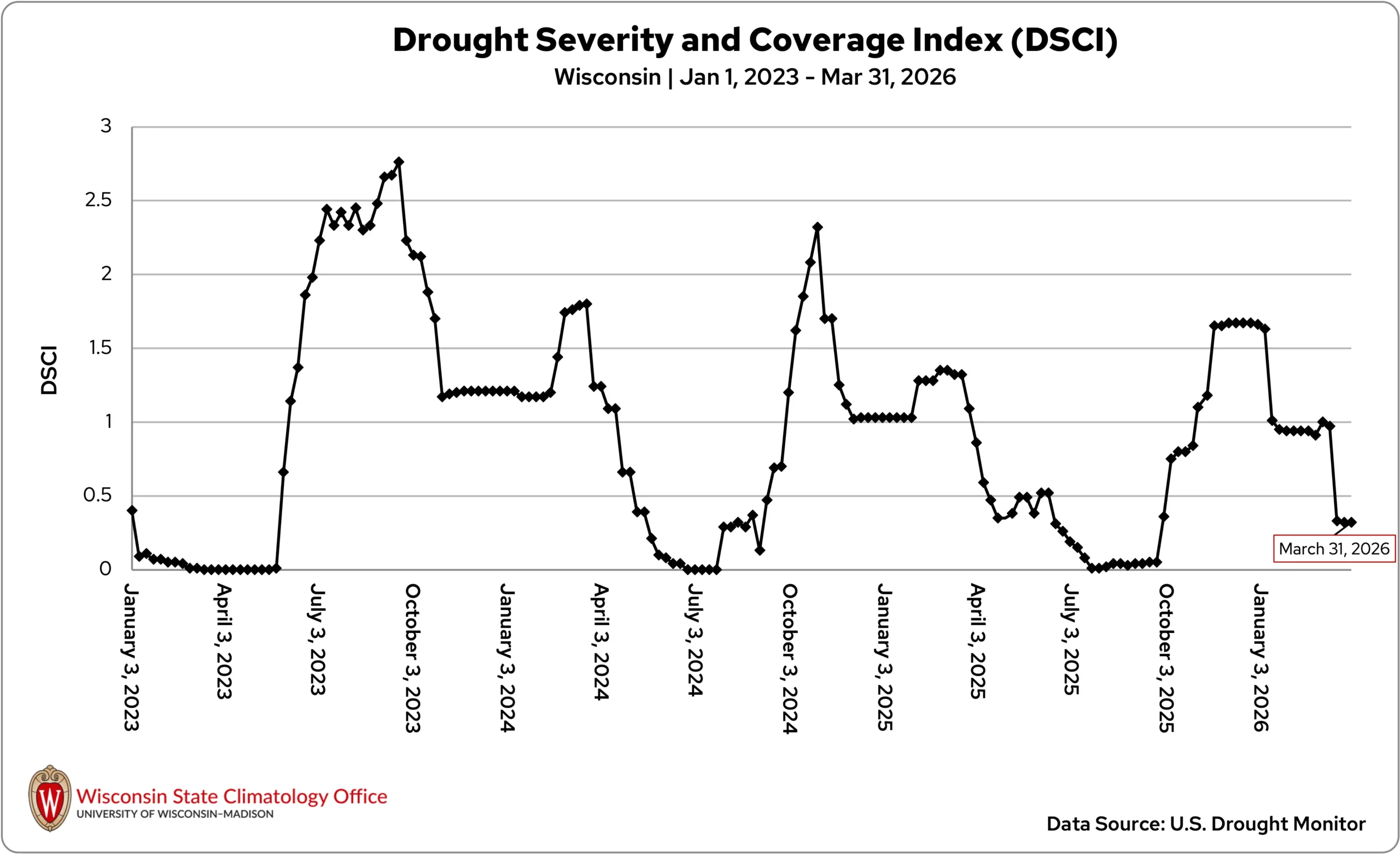 March’s soggy weather helped greatly reduce drought conditions across the Badger State. Following early-month downpours and the mid-month blizzard, the Drought Severity and Coverage Index decreased significantly (Figure 8).